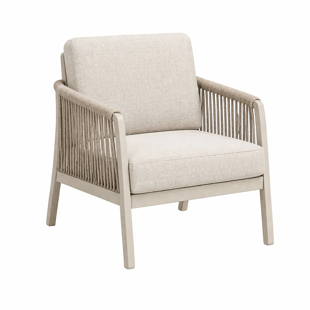 Este sillón cuenta con un marco de aluminio y cojines de tejido de olefina en color beige. El relleno es de espuma de poliuretano, proporcionando comodidad. Tiene una altura total de 85 cm, altura del asiento de 42 cm, ancho de 75 cm y profundidad de 80 cm. Su superficie está acabada con pintura en polvo resistente al clima.