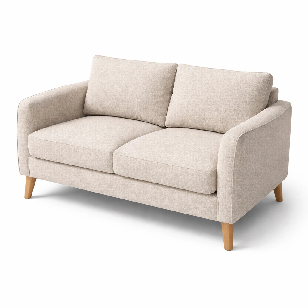 Este sofá de 2 plazas está recubierto con tela de poliéster beige. Los cojines están rellenos de espuma de alta densidad. Las patas son de madera de roble.