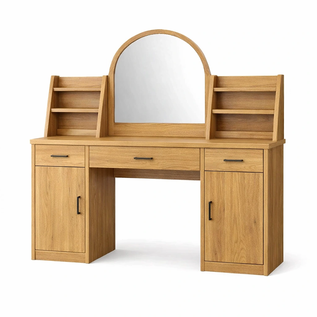 El tocador está fabricado con madera aglomerada y acabado enchapado en roble claro. Cuenta con un espejo de vidrio templado de 4 mm de grosor incorporado y estantes laterales para optimizar el espacio de almacenamiento.