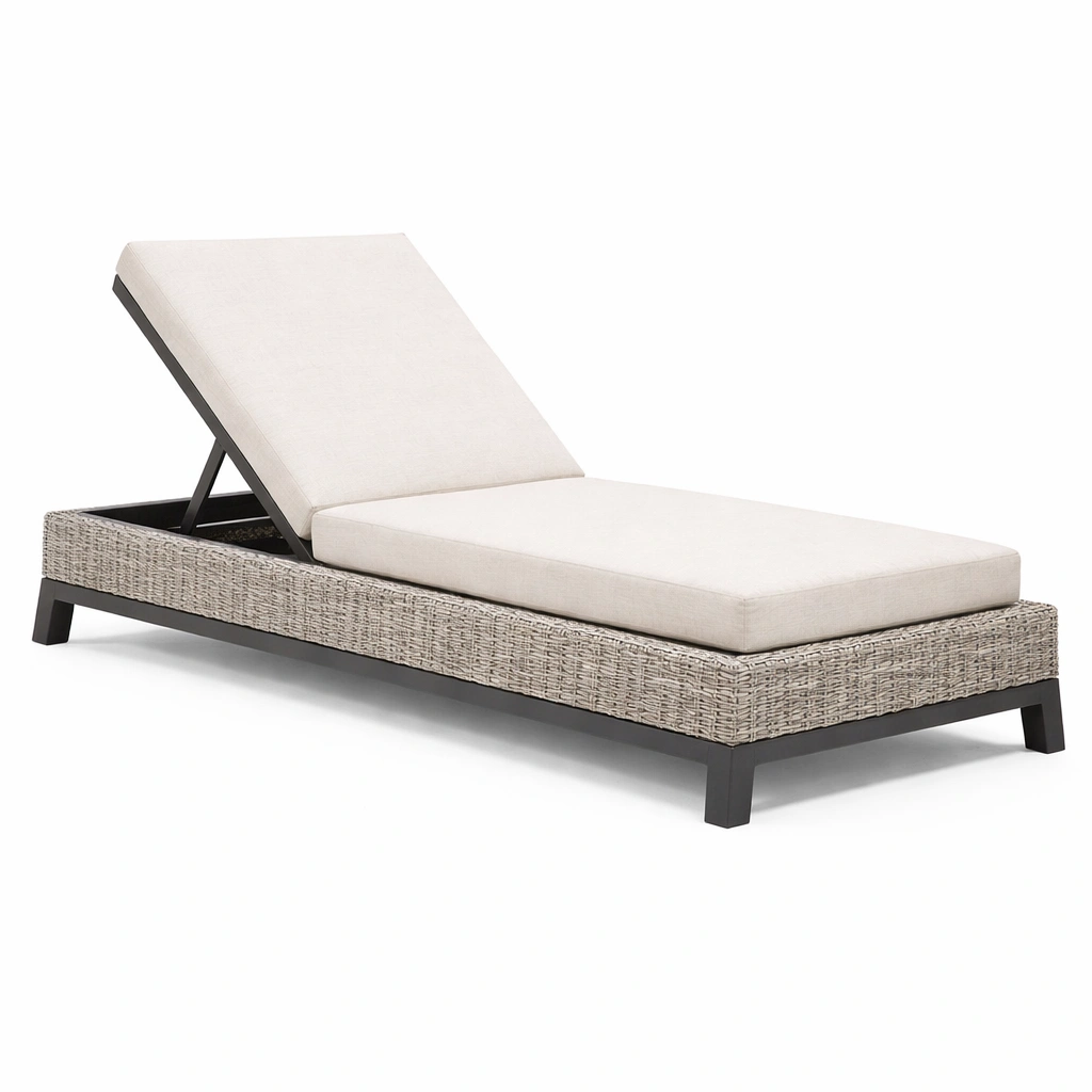 La tumbona está fabricada con un armazón de aluminio cubierto de ratán sintético. Los cojines están hechos de poliéster, ofreciendo comodidad y durabilidad en exteriores.