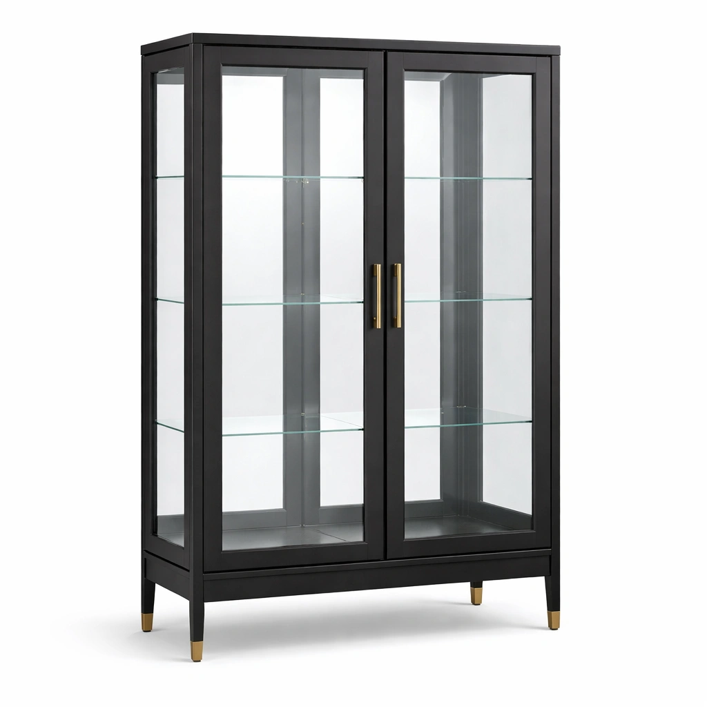 Vitrina de madera MDF con puertas de vidrio templado negro y dorado